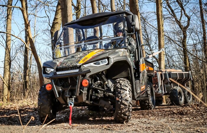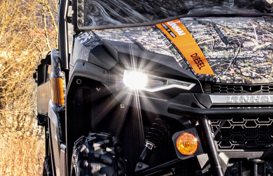 Linhai UTV1100 Diesel также впечатляет своим щедрым оснащением. Оно включает, например, электроусилитель руля, регулируемый по высоте руль, мощную лебедку грузоподъемностью 4500 lbs,