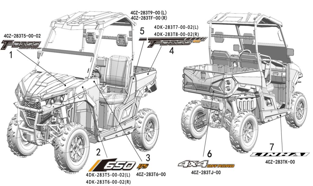 Декоративные наклейки (для белых пластиковых деталей) | Linhai_5_528_t-boss 650 доставим по Украине в течении 2-3-х дней после подтверждения заказа менеджером. Заказ отправляется службами доставки в тот же день, если заказ сделан до 14:00 и товар готов к отправке. Доставка осуществляется курьером магазина или службой доставки "Нова Пошта" и "Meest-Express". Стоимость доставки нашей машиной по Украине 20 грн/км от магазина в обе стороны (100 км=2000 грн). В Киеве, Виннице доставка машиной магазина по цене 300 грн. Стоимость доставки "Нова Пошта" и "Meest-Express" по их тарифам. Так же на многих товарах есть Бесплатная доставка - ищите соответствующий стикер на товаре!