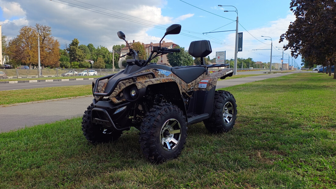 Продуманная эргономика и удобное сиденье обеспечивают комфортную посадку. Интуитивно понятное управление, удобное расположение рычагов и современная цифровая приборная панель с LCD-дисплеем делают эксплуатацию квадроцикла максимально простой и приятной. Камуфляжная расцветка помогает машине сливаться с окружающей средой.