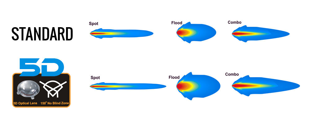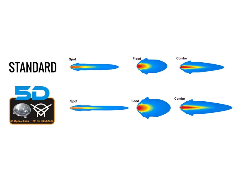 Светодиодные фонари с технологией 5D в настоящее время являются самыми современными и популярными светодиодными фонарями. 5D светодиодные фары используют для рассеянного и точечного луча специальные светодиодные модули с линзами типа «рыбий глаз», которые излучают луч света под чрезвычайно широким углом 150о без слепых зон. Таким образом, они обеспечивают значительно лучший уровень освещения по сравнению с обычными светодиодными фонарями, а также освещают пространство перед вами на большее расстояние.