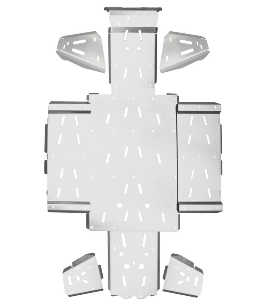 Алюминиевые крышки шасси Shark из прочного и легкого 4-миллиметрового алюминия авиационного качества — лучший способ защитить нижнюю часть вашего UTV, A-образные рычаги и моторный отсек от повреждений камнями, скалами и другими природными врагами. Включая встроенные крышки подножек. Изготовлены из чрезвычайно прочного алюминиевого сплава авиационного качества. Включая монтажные отверстия для легкого обслуживания машины без необходимости демонтажа крышек.
