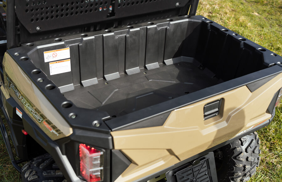 T-Boss 650 розроблений для максимального комфорту та безпеки. Він має зручні сидіння типу "side-by-side" для двох пасажирів, що робить поїздки комфортними. Ергономічний дизайн, зручний кермо, цифрова приладова панель з LCD-дисплеєм та наявність даху і скла забезпечують захист від погодних умов та підвищують зручність експлуатації.