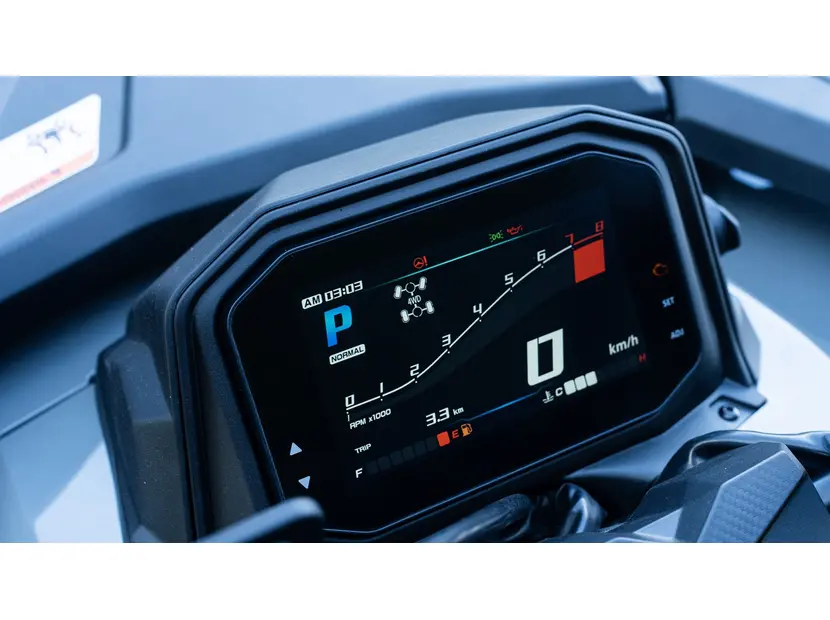 Сучасний 7-дюймовий TFT-дисплей автоматично перемикається між денним і нічним режимами залежно від умов освітлення і чітко відображає всю важливу інформацію, таку як швидкість, оберти, температура двигуна або рівень палива у високій роздільній здатності. Також є індикатор передачі та обраного режиму руху.