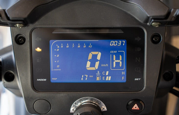 Багатофункціональний РК-дисплей із синім підсвічуванням надає всю важливу інформацію про поточну швидкість, оберти двигуна, пробіг, увімкнену передачу та режим руху, температуру охолоджувальної рідини або рівень палива.