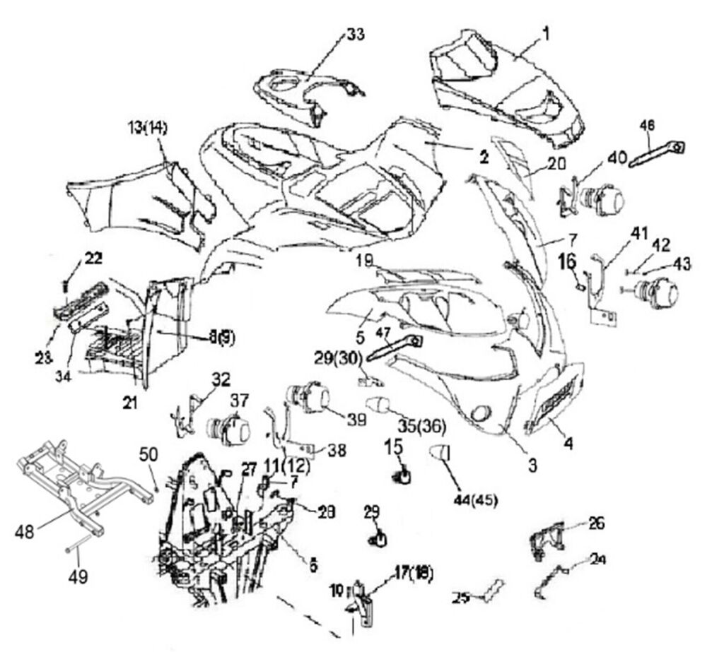 Передня частина кузова і рама | Linhai_4_404_atv400-2b irs доставимо по Україні протягом 2-3 днів після підтвердження замовлення менеджером. Замовлення відправляється службами доставки в той же день, якщо замовлення зроблено до 14:00 і готовий до відправки. Доставка здійснюється кур'єром магазину або службою доставки "Нова Пошта" та "Meest-Express". Вартість доставки нашою машиною по Україні 20 грн/км від магазину в обидва боки (100 км = 2000 грн). У Києві, Вінниці доставка машиною магазину за ціною 300 грн. Вартість доставки "Нова Пошта" та "Meest-Express" за їх тарифами. Також на багатьох товарах є Безкоштовна доставка – шукайте відповідний стікер на товарі!