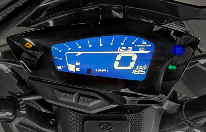 Синьо-біла РК-панель відображає всі важливі дані – швидкість, оберти, рівень палива, час і пробіг. Читабельність відмінна навіть під прямими сонячними променями.